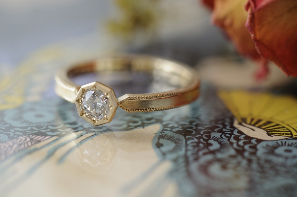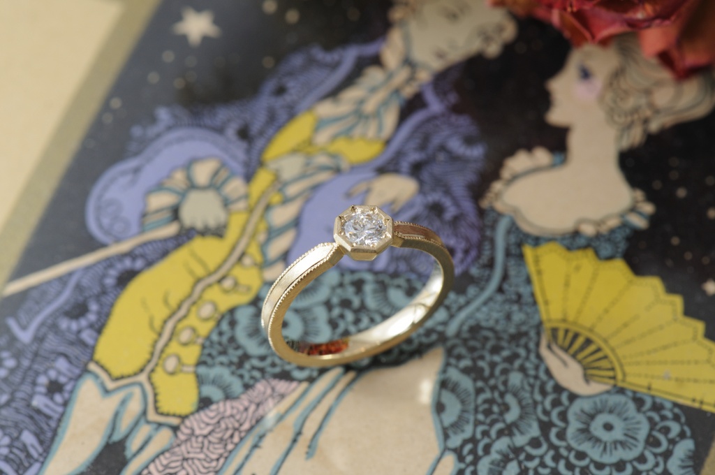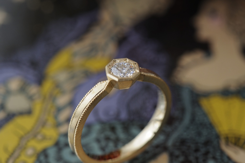 まるでアンティークのような佇まいのこの婚約指輪は、石座部分を八角形にしました。