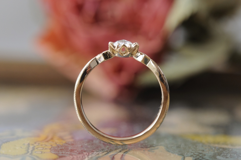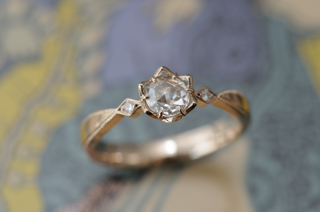 お花の上に、露が溜まったような印象を受ける、瑞々しいローズカットのエンゲージリングです。