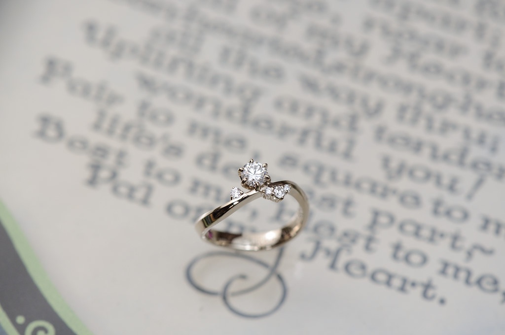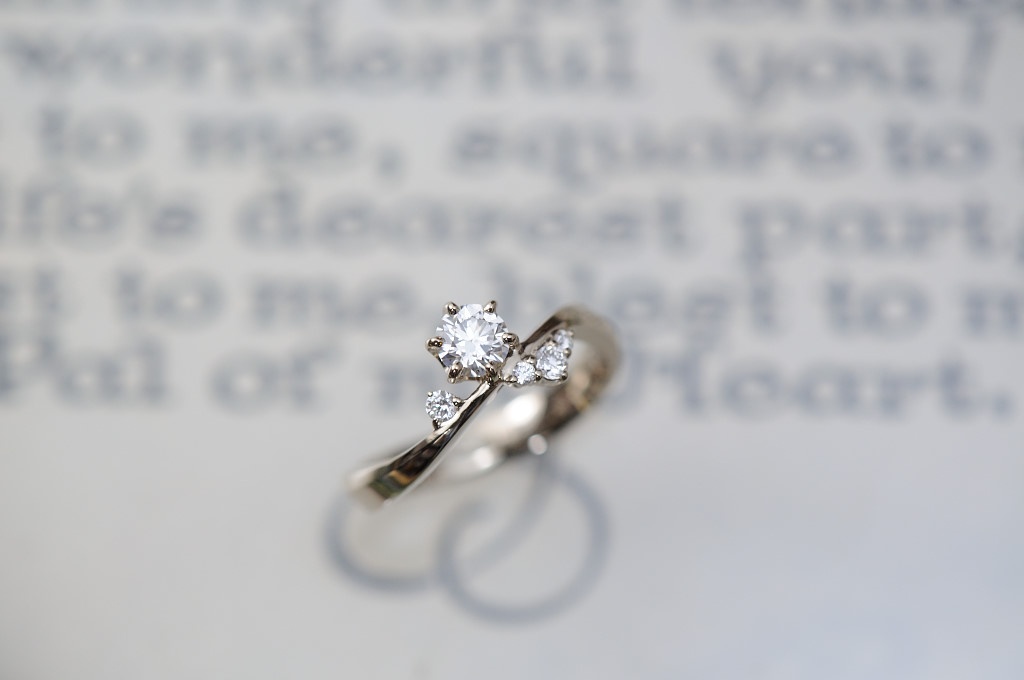 婚約指輪 2019.02.11 オーダーメイド婚約指輪//wave 朝露の様に、しなやかなウェーブにメレダイヤがランダムに配されたオリジナルラインのカスタムです。 色味をシャンパンゴールドにすることで、一気にナチュラルな印象に変わりました。 商品についてのご相談・ご予約・お問い合わせはこちら