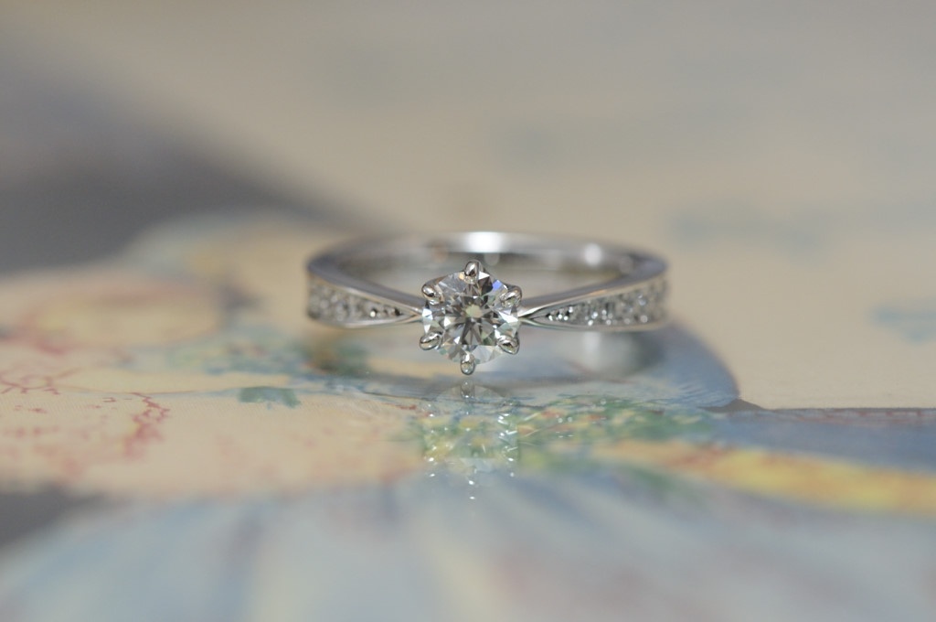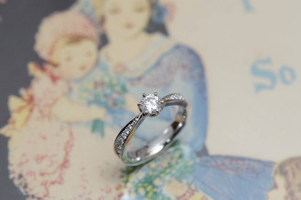 福永宝飾店モデル 2019.02.11 オーダーメイド婚約指輪//シェイプリング きりりとクールなプラチナに、上質なダイヤモンドを添えて、メレダイヤもしっかりと配置しました。 側面も平らに、エッジのきいた美しい指輪にお仕立てしました。 商品についてのご相談・ご予約・お問い合わせはこちら