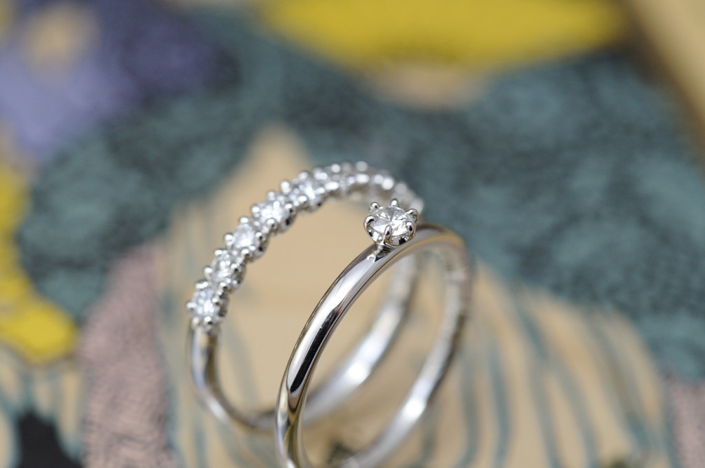福永宝飾店モデル 2019.02.10 オーダーメイド婚約指輪//ハーフエタニティ ソリテール お手持ちのダイヤモンドなどを使ってリメイクしました。 あえて2本のリングに分けて、2倍も3倍も楽しめるデザインにお仕立ていたしました。 商品についてのご相談・ご予約・お問い合わせはこちら