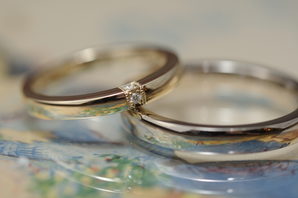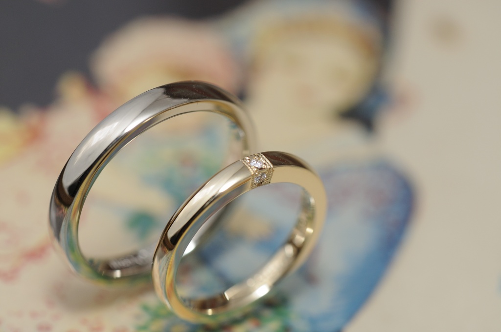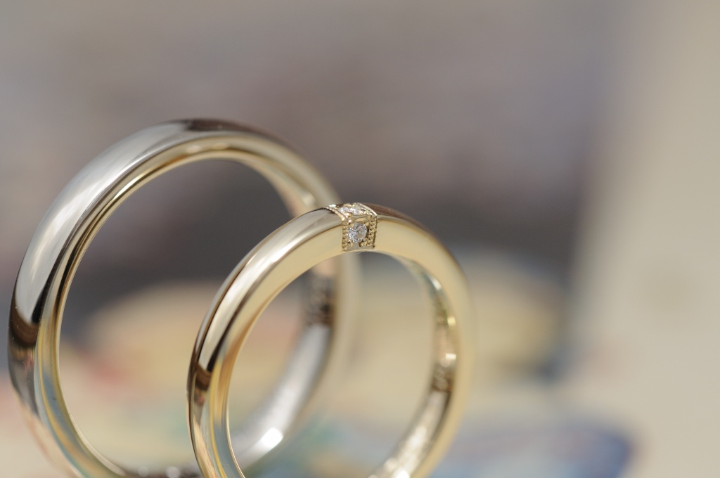 ホワイトゴールドとイエローゴールドの組み合わせと、鏡面仕上げがペア感をしっかりと出してくれます。
