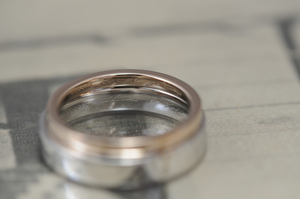 メンズはプラチナの平打ちタイプ。幅はすこし太めなタイプです。