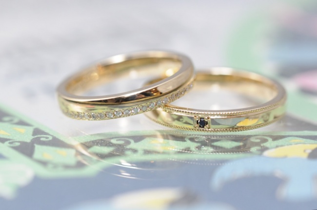 メンズは、両側にミルグレインを入れて、中央にはブラックダイヤを1ピース。
