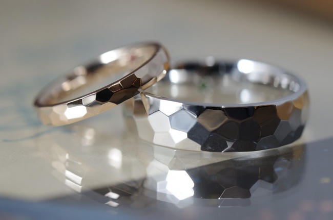 ボリュームのある鏡面鎚目のオーダーメイド結婚指輪
