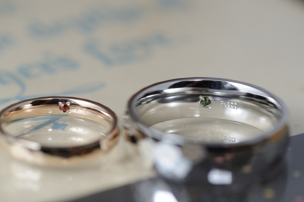 メンズはったプリとしたボリューム、レディースは程よいボリューム感の鎚目の結婚指輪です。