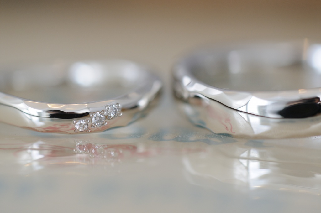 ピカピカの鏡面仕上げと、鎚目のキラキラ、ダイヤの輝きが合わさって、たくさんの表情を見せてくれる結婚指輪です。