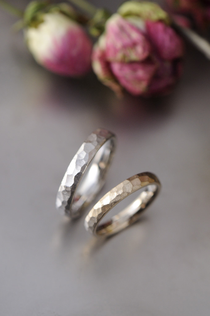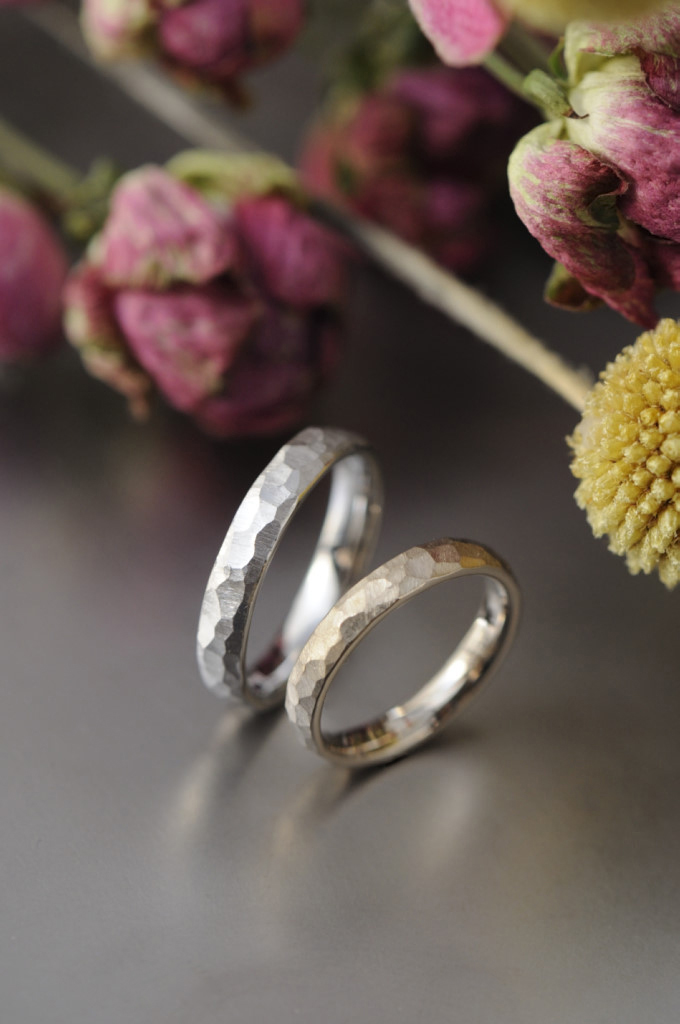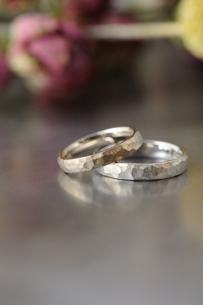 ひと鎚ごとに叩いて制作していく鎚目の指輪。