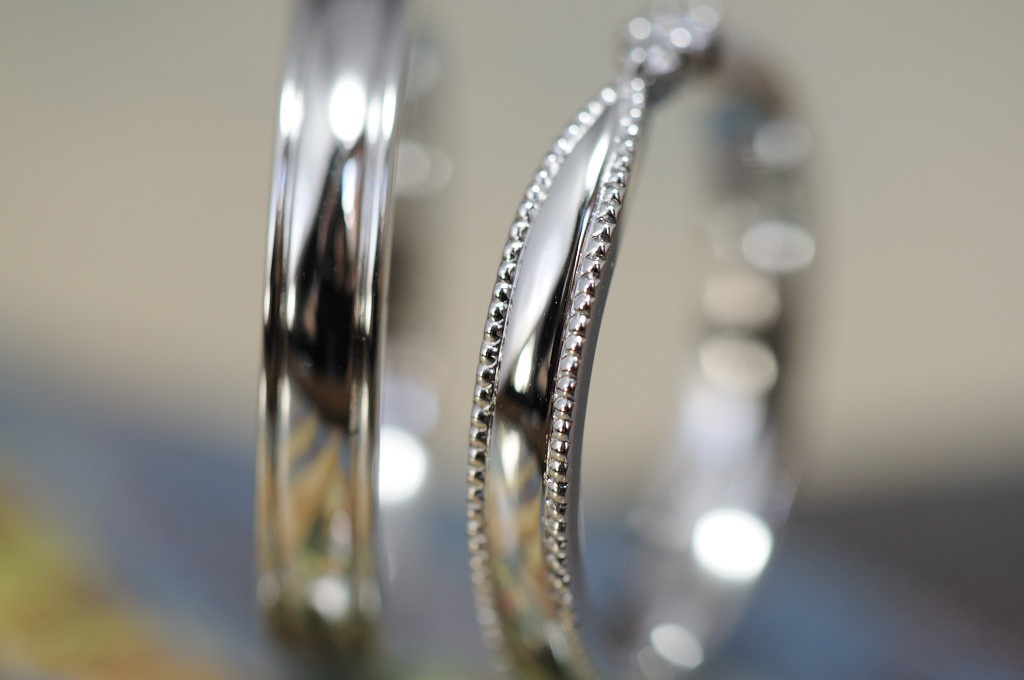流れるように大粒のミルグレインを入れて、プラチナの端正な美しさとミルグレインの華やかさが相まって、女性らしいリングとなりました。
