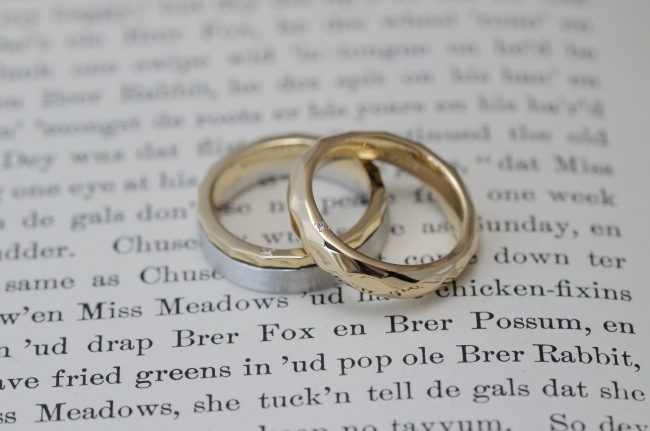 レディースはイエローゴールドで、鎚目のような、ひし形を崩したようなとてもラフな仕上がりの加工を施しました。