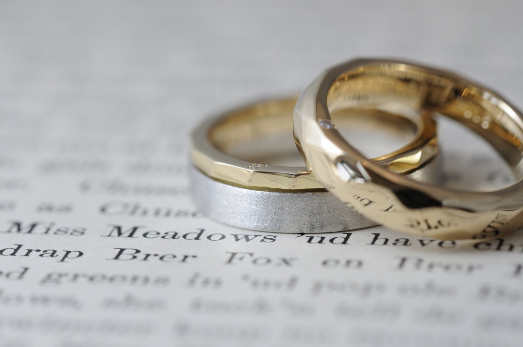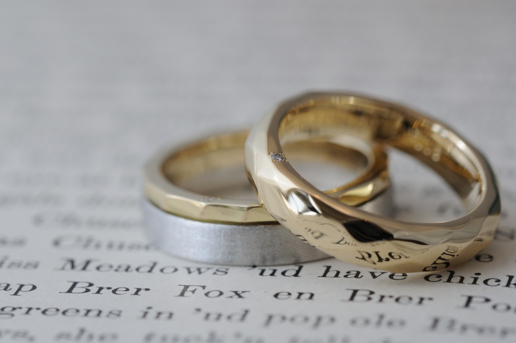 全く違うデザインのようで、同じ加工をそれぞれに入れることで、ペアらしさもあるリングになりました。