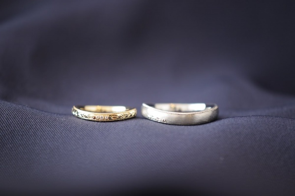 メンズには片側だけにミルグレインを入れて、表面はマットなテクスチャで仕上げました。アクセントとして少しだけ入っている彫りは、もちろんレディースとお揃いです。