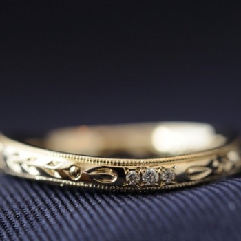 緩いV字リングをベースに、レディースには全体への彫りとミルグレイン。そしてダイヤが計7ピース。