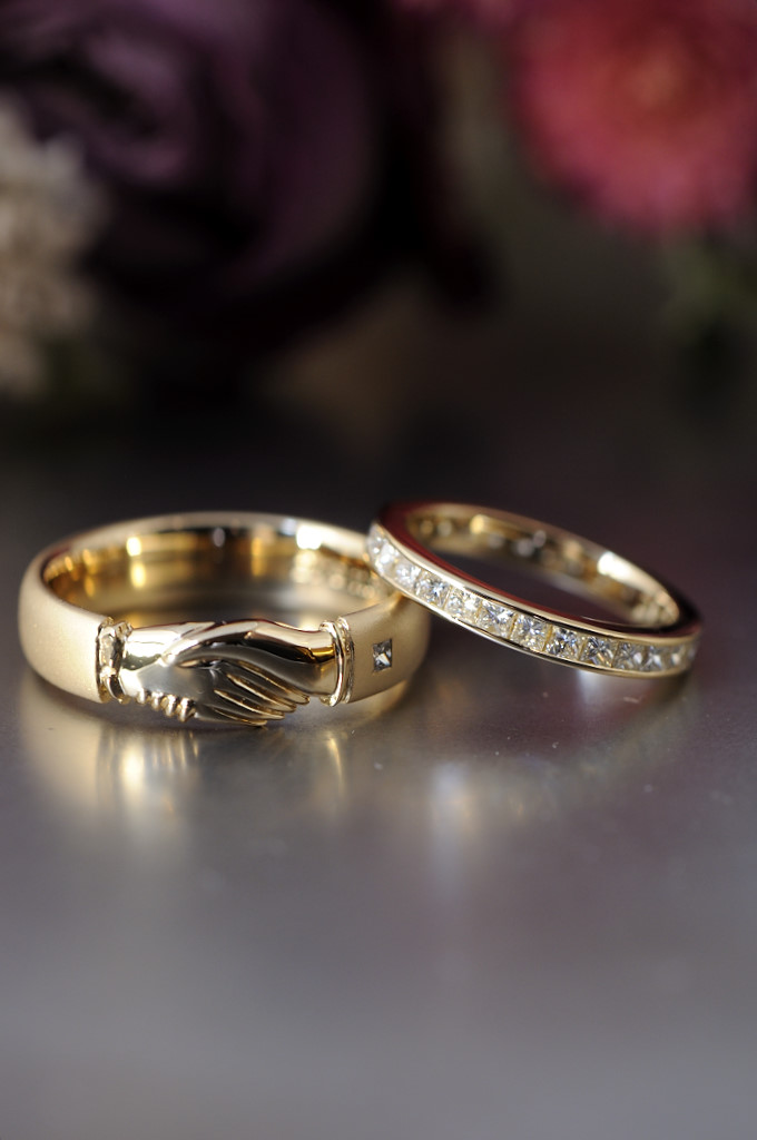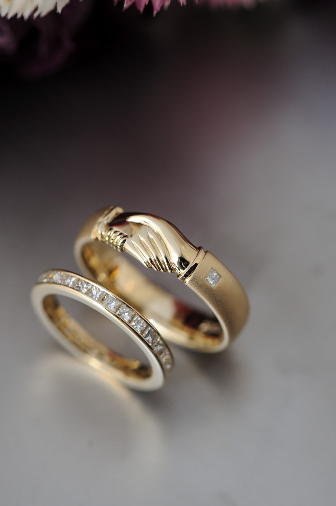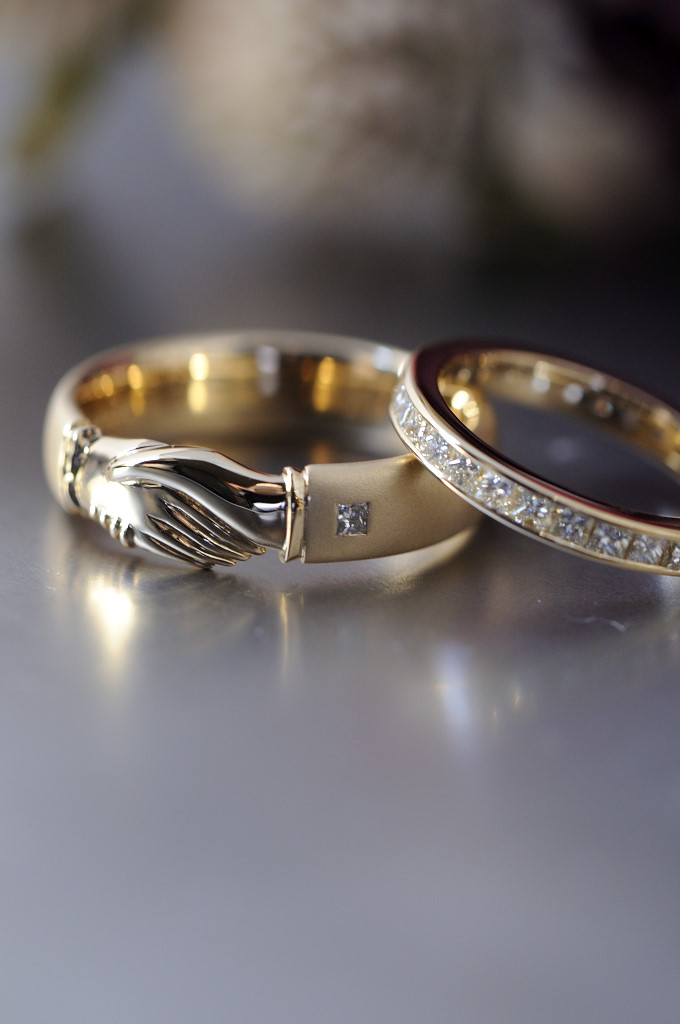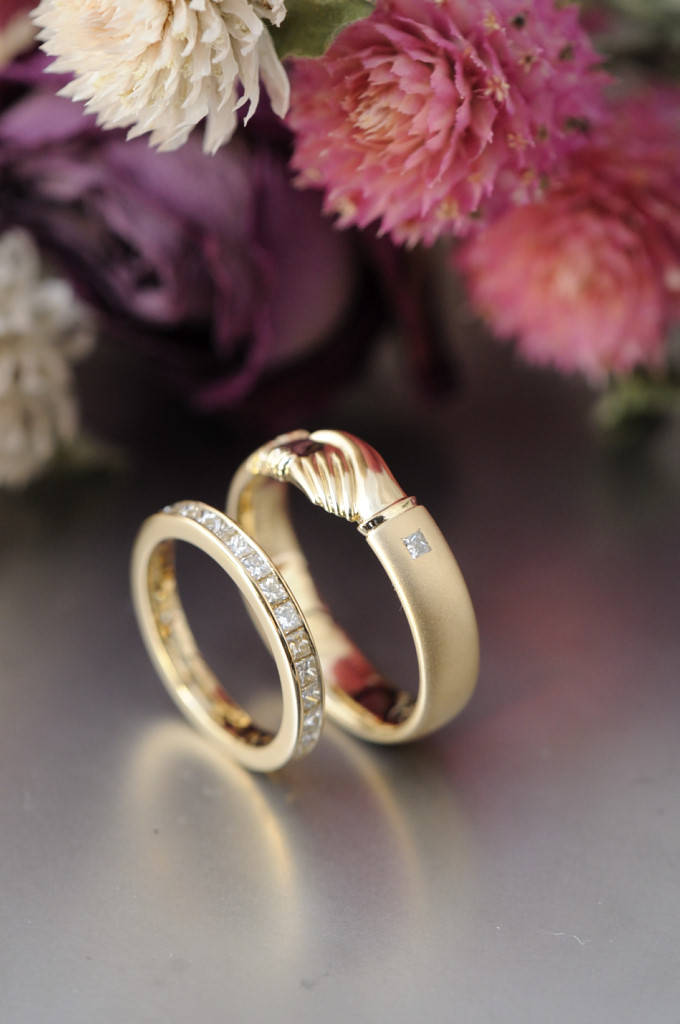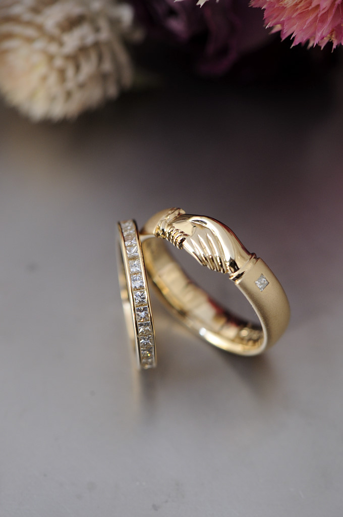 フェデリングの袖口に葉、レディースとお揃いのプリンセスカットを留めました。