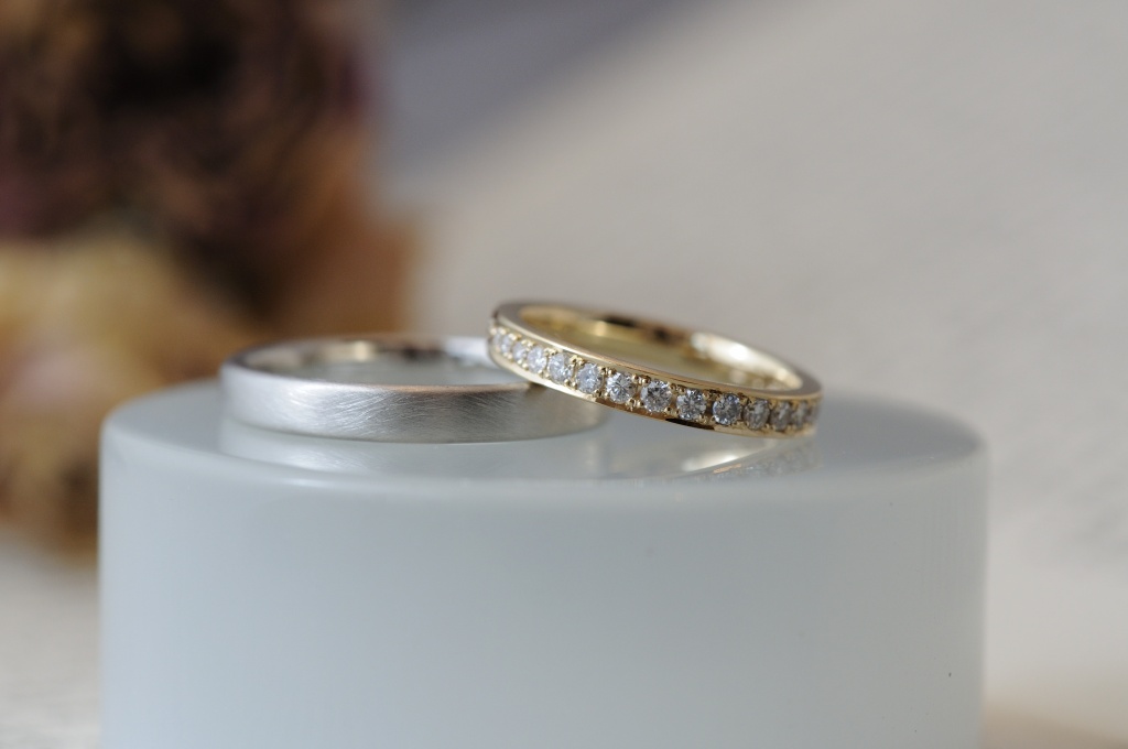 メンズレディースともに平打ちタイプですが、角を丸くすることで優しい印象に仕上がりました。