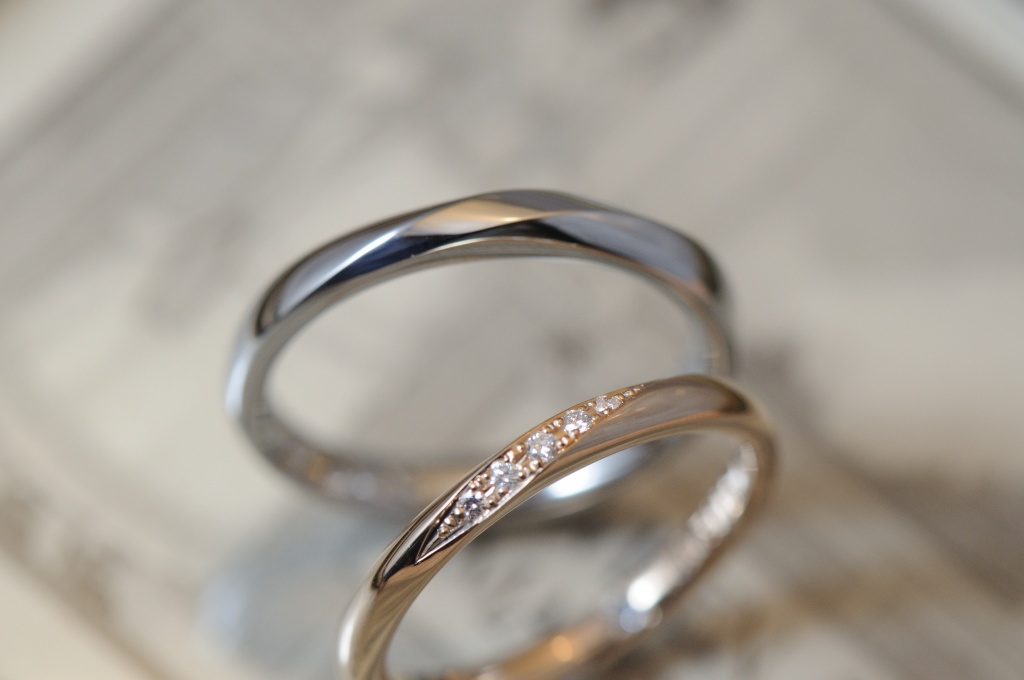 レディースはひねり部分にダイヤモンドを5石並べています。