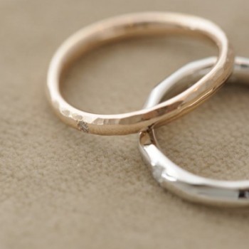 メンズは、表面をラフに削り出して、少し彫刻のような雰囲気に、レディースはそれに合わせて、でもくどくならないように両サイドのみ槌目を入れてメンズと揃えました。