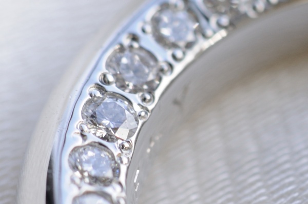 デザインの高さを生かして、女性用のリング側面には全周にわたってメレダイヤを留めてあります。