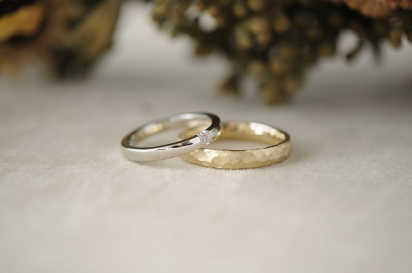 ゴールドの鎚目&プラチナ クラシカルスタイルのオーダーメイド結婚指輪
