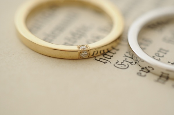 四角いリングに、女性には3面にダイヤモンドが入っています。ダイヤは彫留めで、トップ、両サイドのダイヤの周りにはミルグレインを施しました。