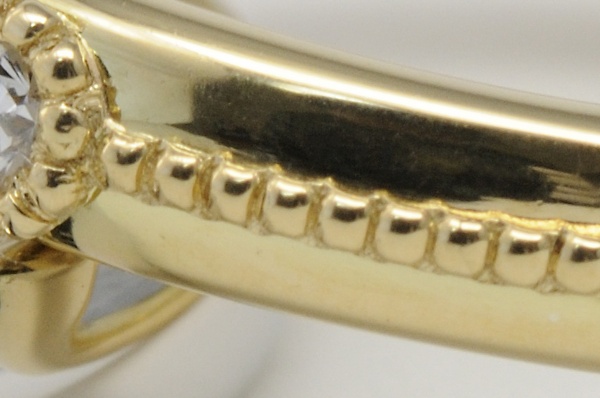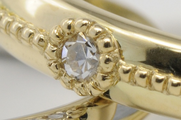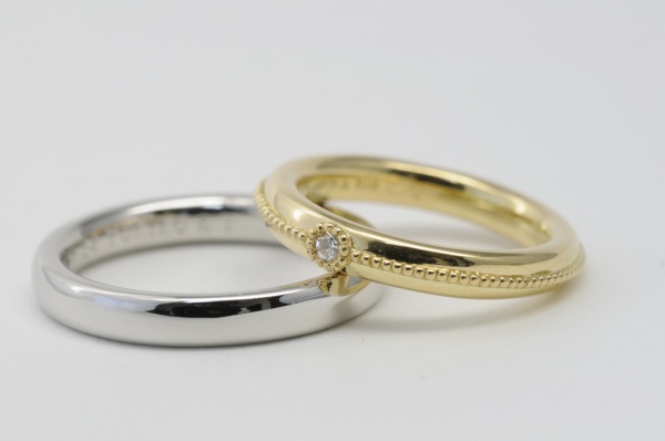 女性用にK18、男性用にプラチナ900を使用したクラシック&シンプルな結婚指輪です。女性用には繊細なミルグレンをリングの全周に渡ってほどこしました。また特徴的な輝きのダイヤは「シングルカット」のダイヤを使用しています。現在主流の「ラウンドブリリアントカット」が生み出される前の、わずか17面のシンプルなカットがクラシカルで落ち着いた輝きをもたらしています。また、女性用・男性用ともにボリュームのあるデザインとなっており、そのぽってりとしたフォルムは存在感抜群です。