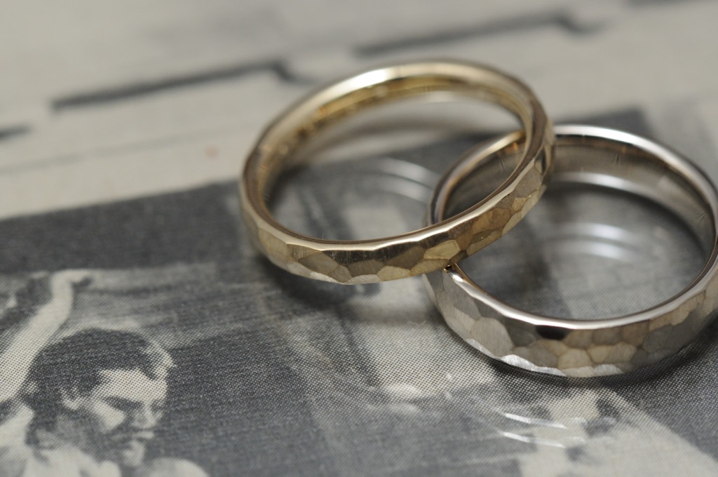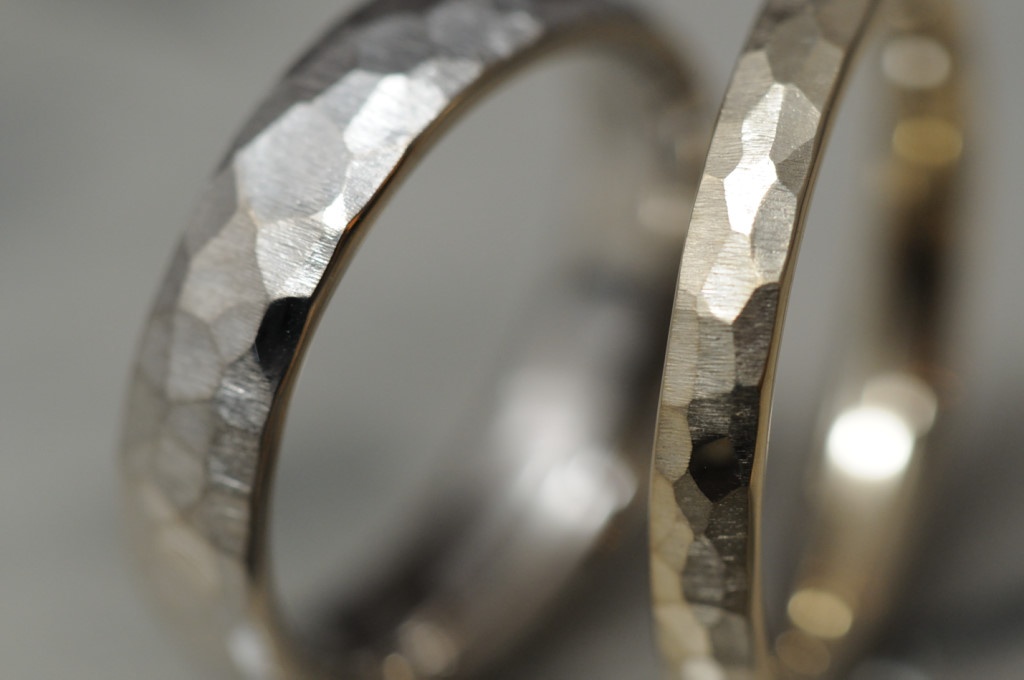 金鎚を指輪に打ちつけることで出来上がる鎚目加工のオーダーメイドの結婚指輪です。