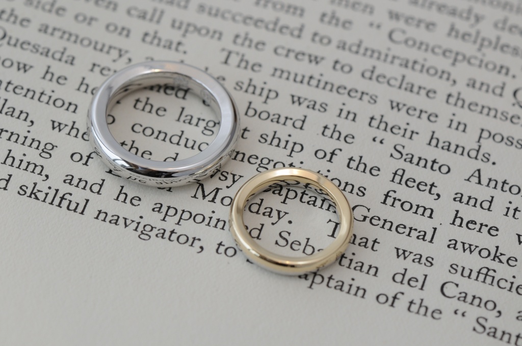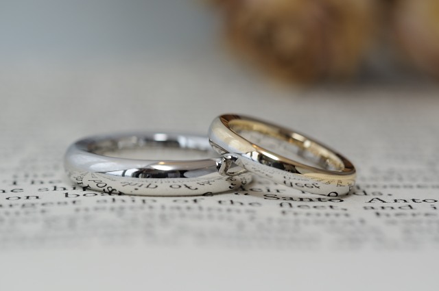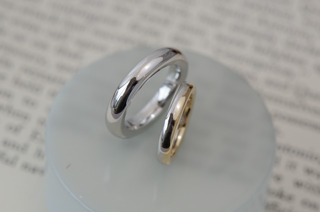 メンズはシンプルにプラチナ一色、レディースは、プラチナとイエローゴールドをコンビで組み合わせました。