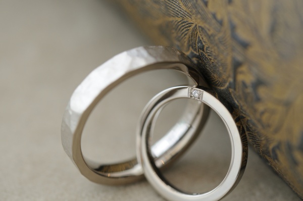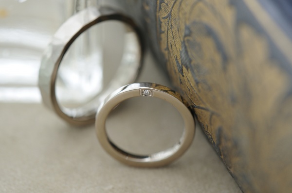 メンズは、トップを金槌で打ち付けるテクスチャをつけています。ホワイトゴールドに、金槌のテクスチャがとても渋く映えます。横からは鏡面が覗きます。