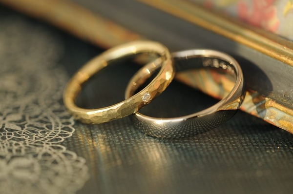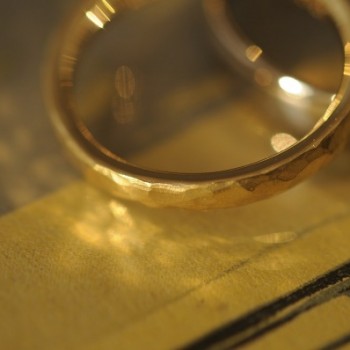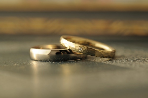 レディースにはマットな槌目を施し、メンズは幅を少し出してシンプルに。