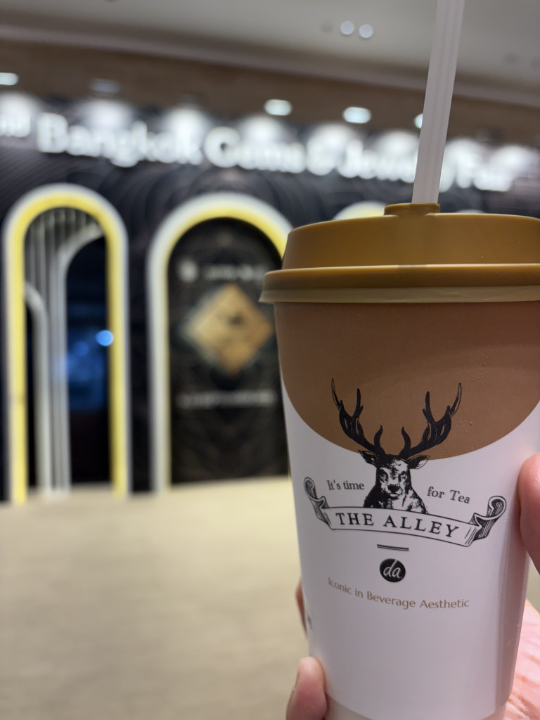 写真は、初日だったか何日目だったか、時間が来たので退出して購入したミルクティーと会場入り口。