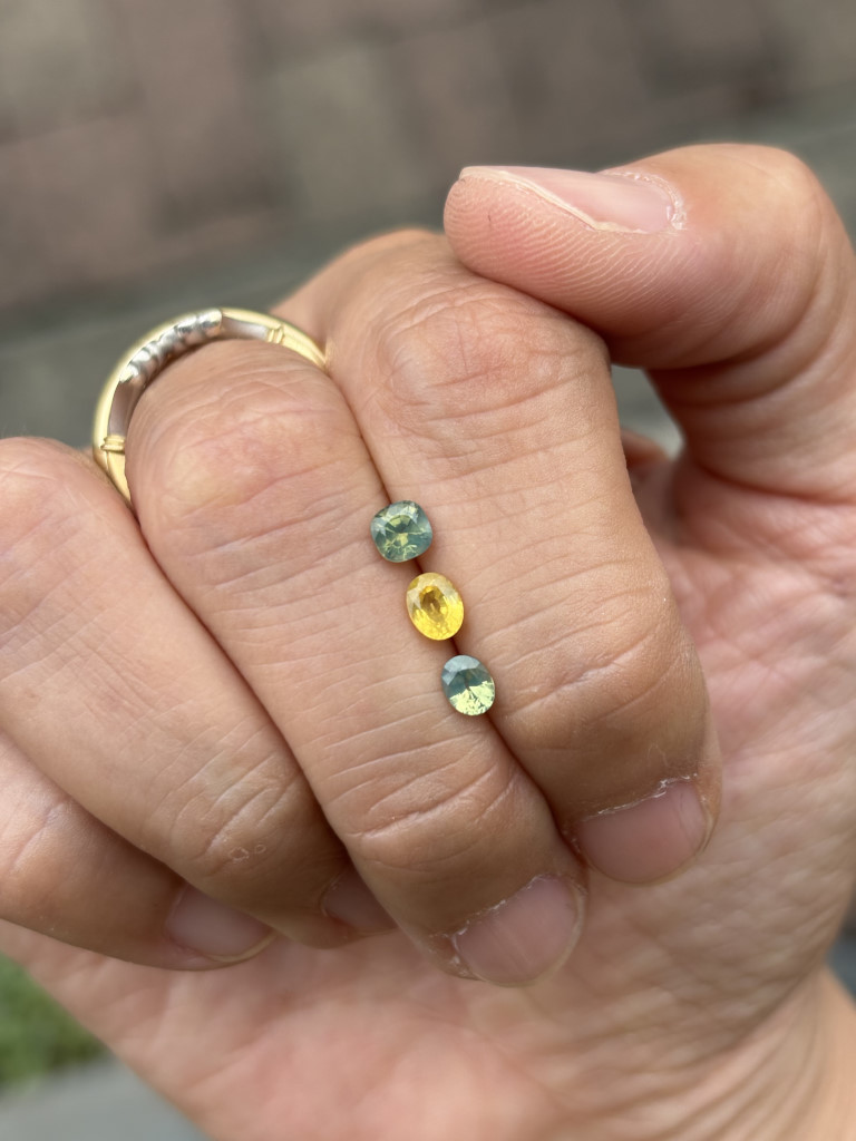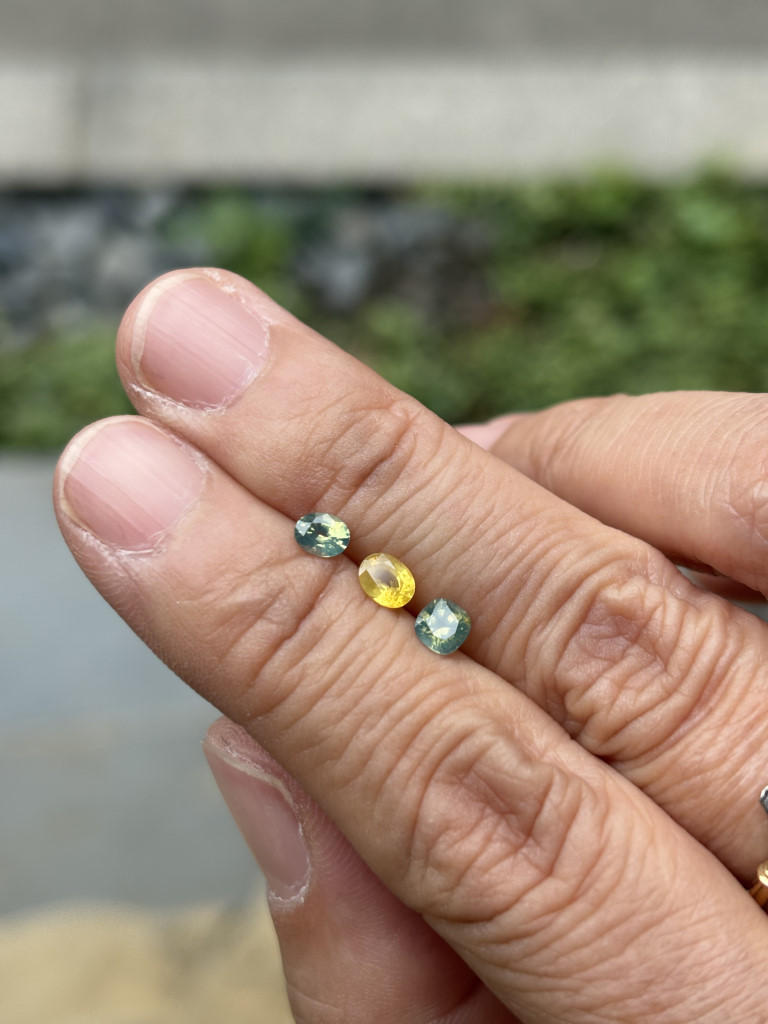 すごく小粒ですが、このど真ん中のイエローが目に留まって、いろいろ話を聞いていると、オーストラリアのサファイアは、グリーン系が多い中黄色は10%ほどしか取れないということでした。