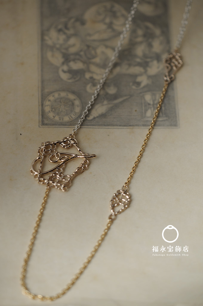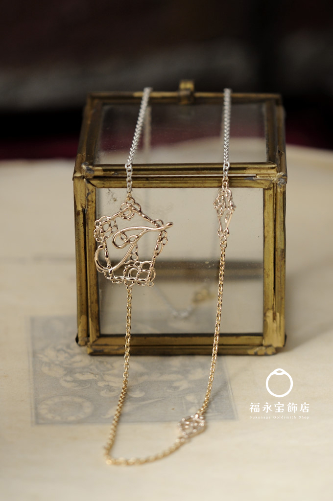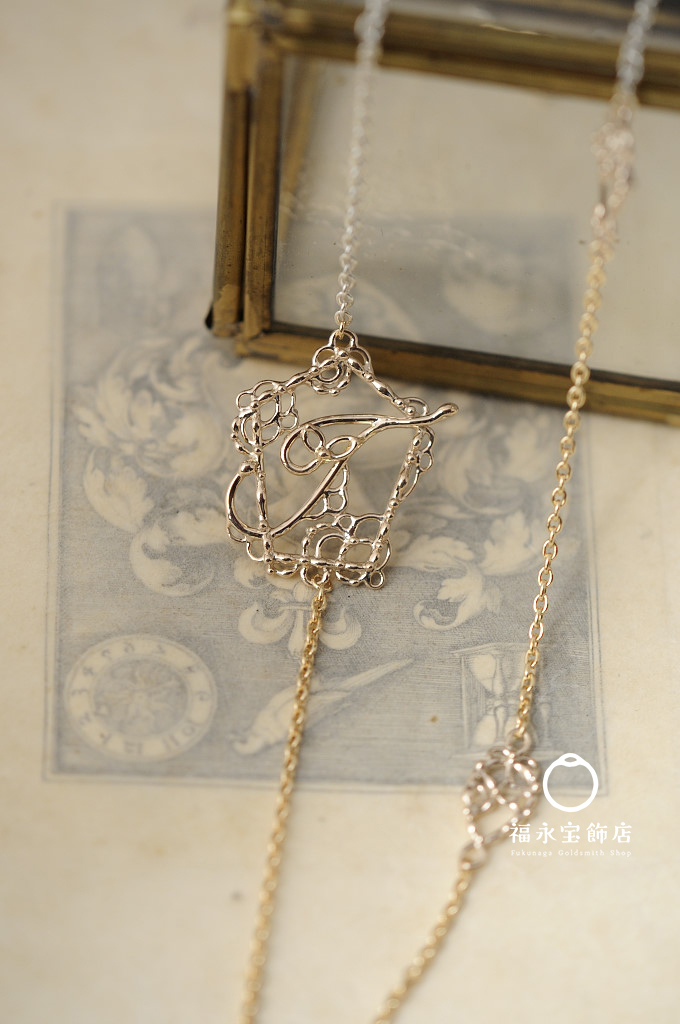 ジュエリーオーダーメイド 2025.10.23 イニシャルペンダント フルオーダーでお仕立てしたイニシャルペンダント。 店頭のものは80㎝とlongネックレスなのですが、今回は50㎝程度の短いタイプ。 かつ、チェーンの色をイエローゴールドとシルバーのチェーンでコンビにしました。 パーツはK10です。 とても素敵にまとまりました。 チェーンのコンビ、いいですよね。 レースのイニシャルも久しぶりに作りました。 また増やしておかなくては。