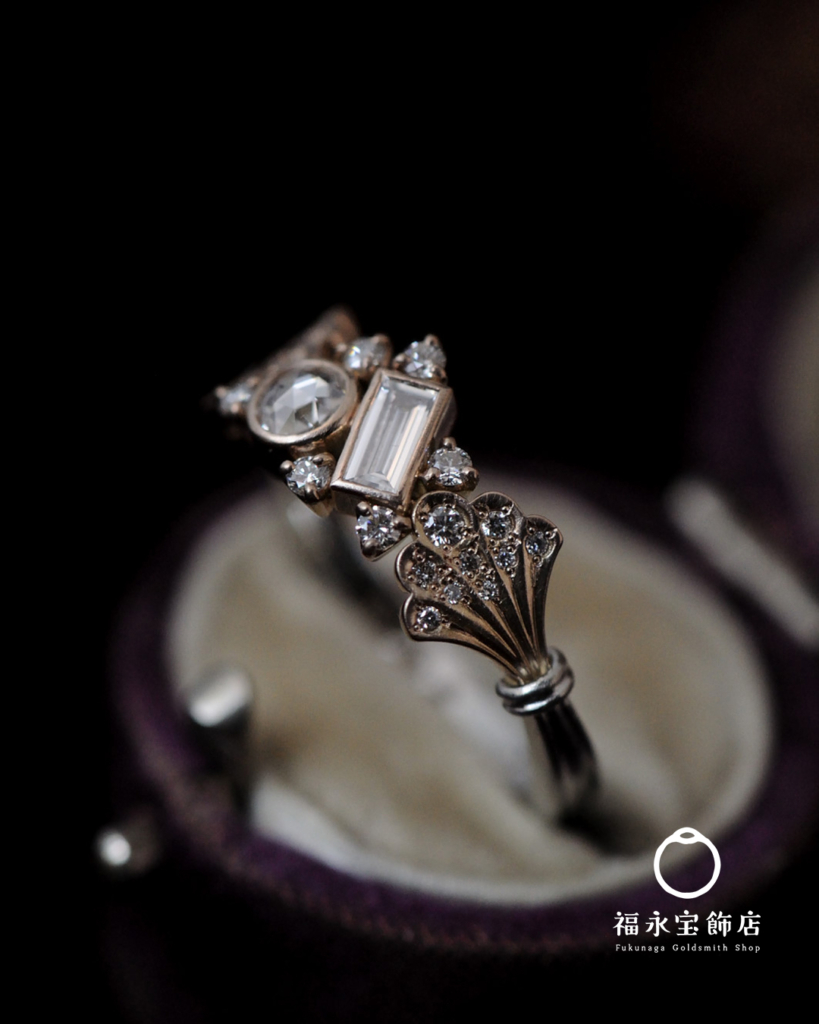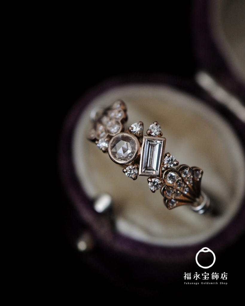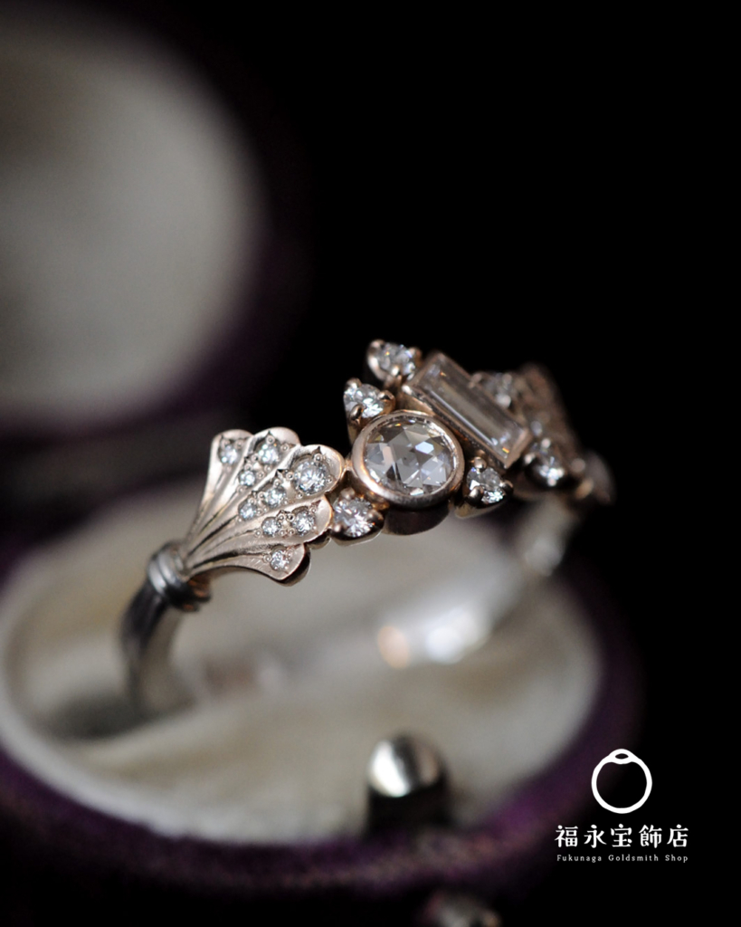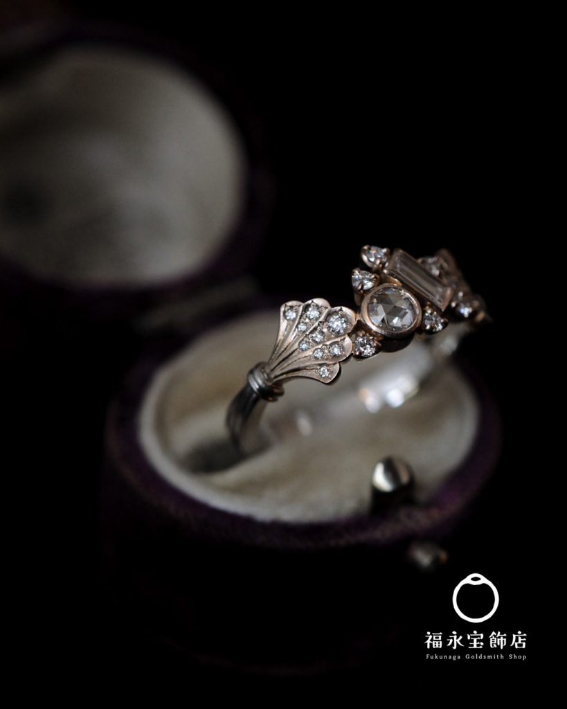 バゲットとローズカットをメインに、メレダイヤを配して貝殻リングで挟み込みました。