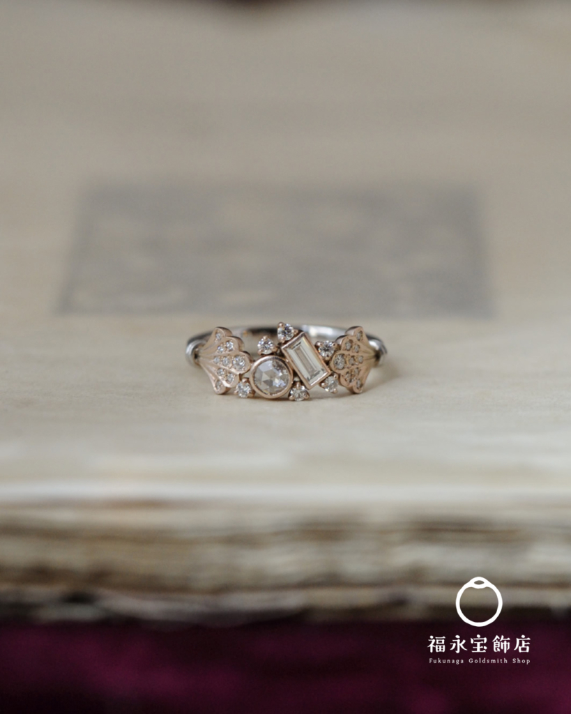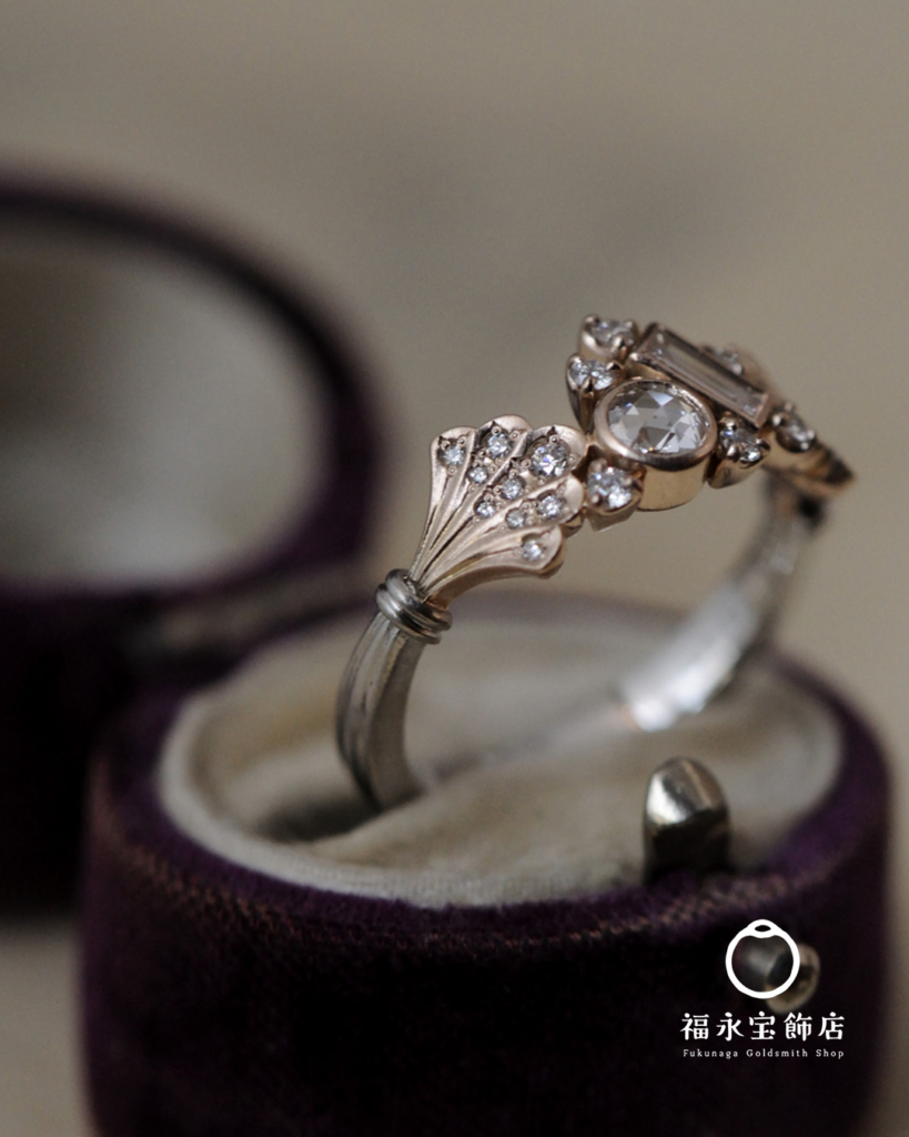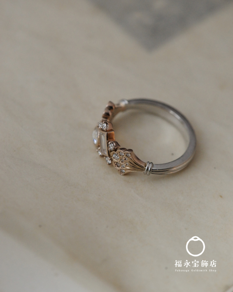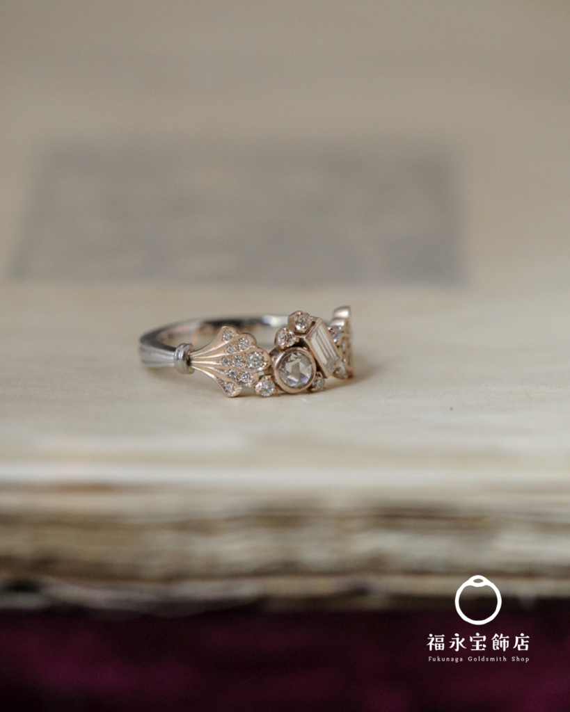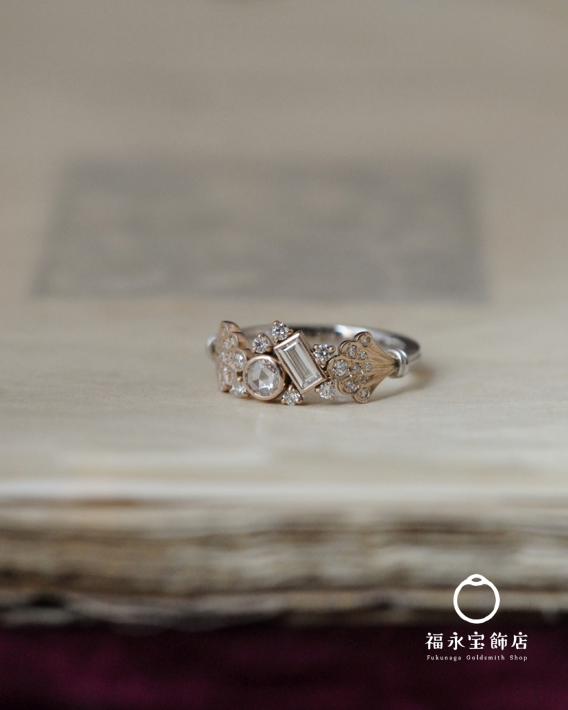 バゲットとローズカットをメインに、メレダイヤを配して貝殻リングで挟み込みました。
