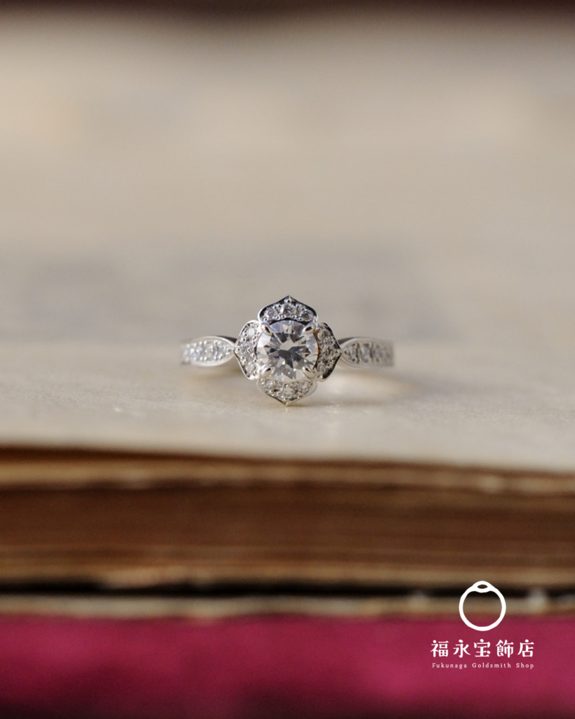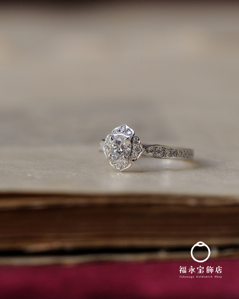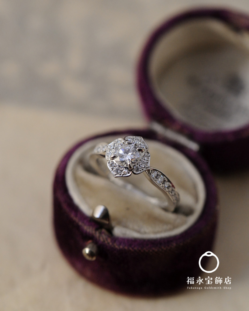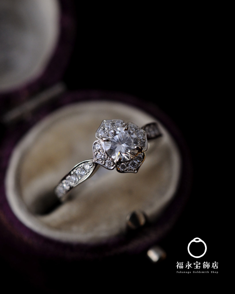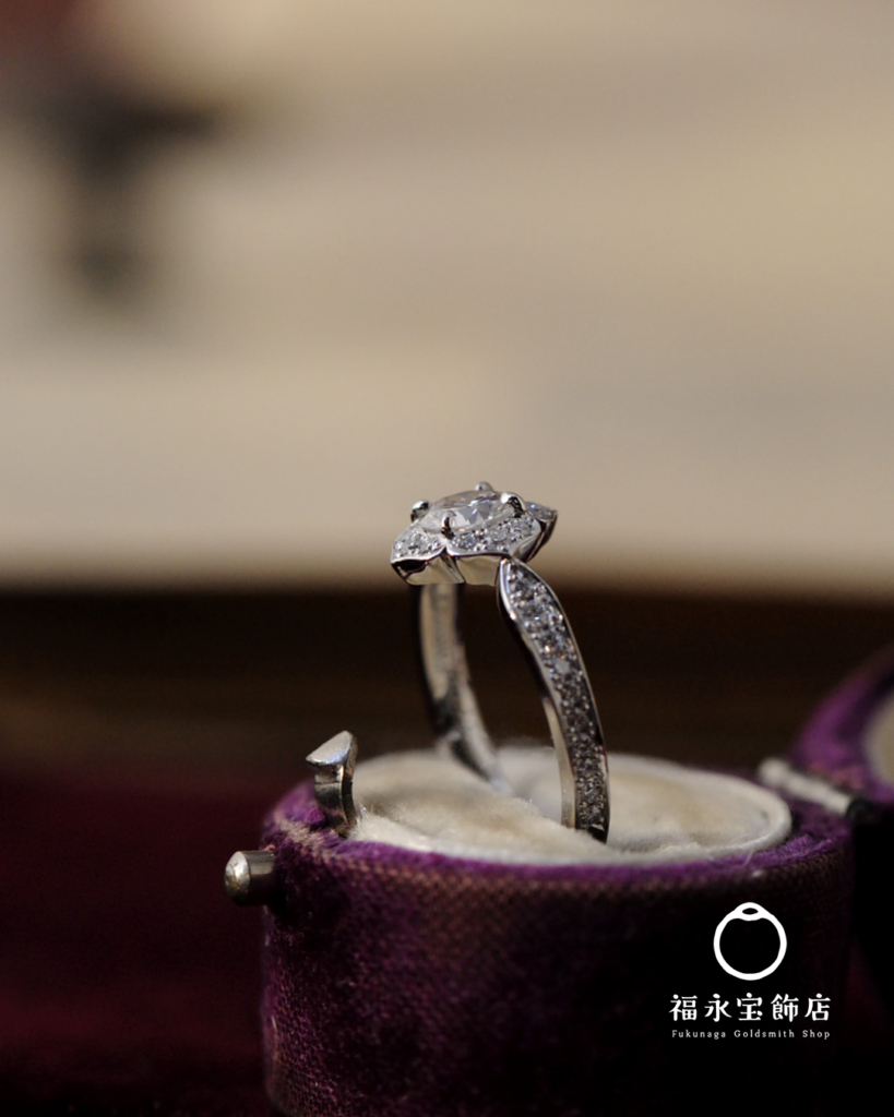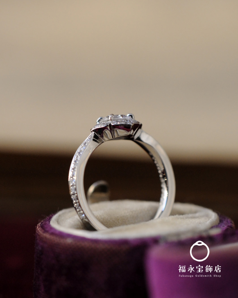 お手持ちのシンプルなダイヤリングを、福永宝飾店のオリジナルデザイン、(名前はまだない)に落とし込みました。