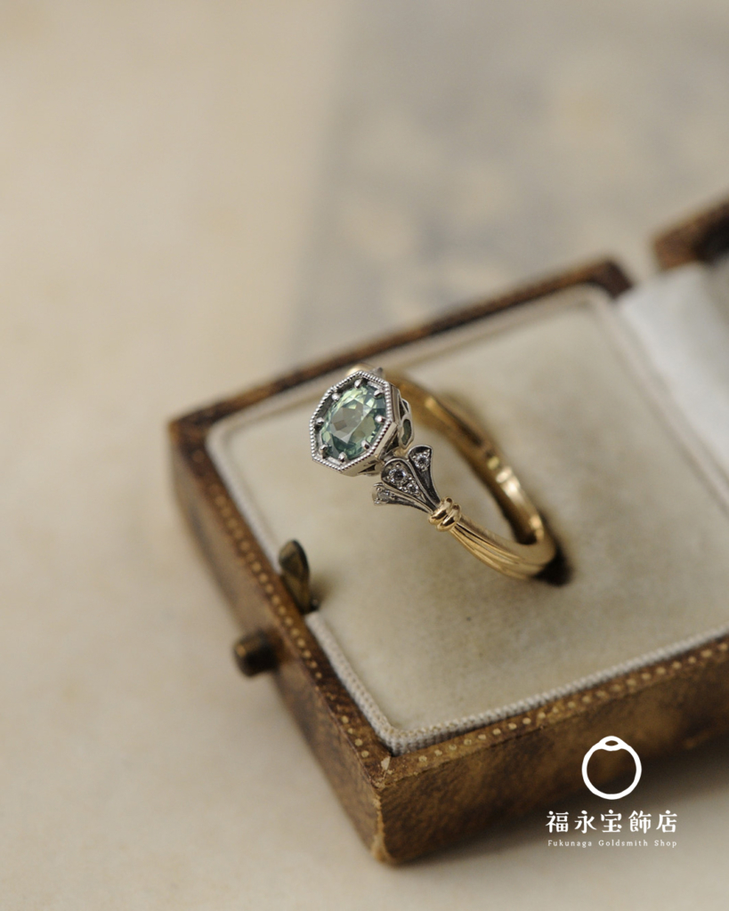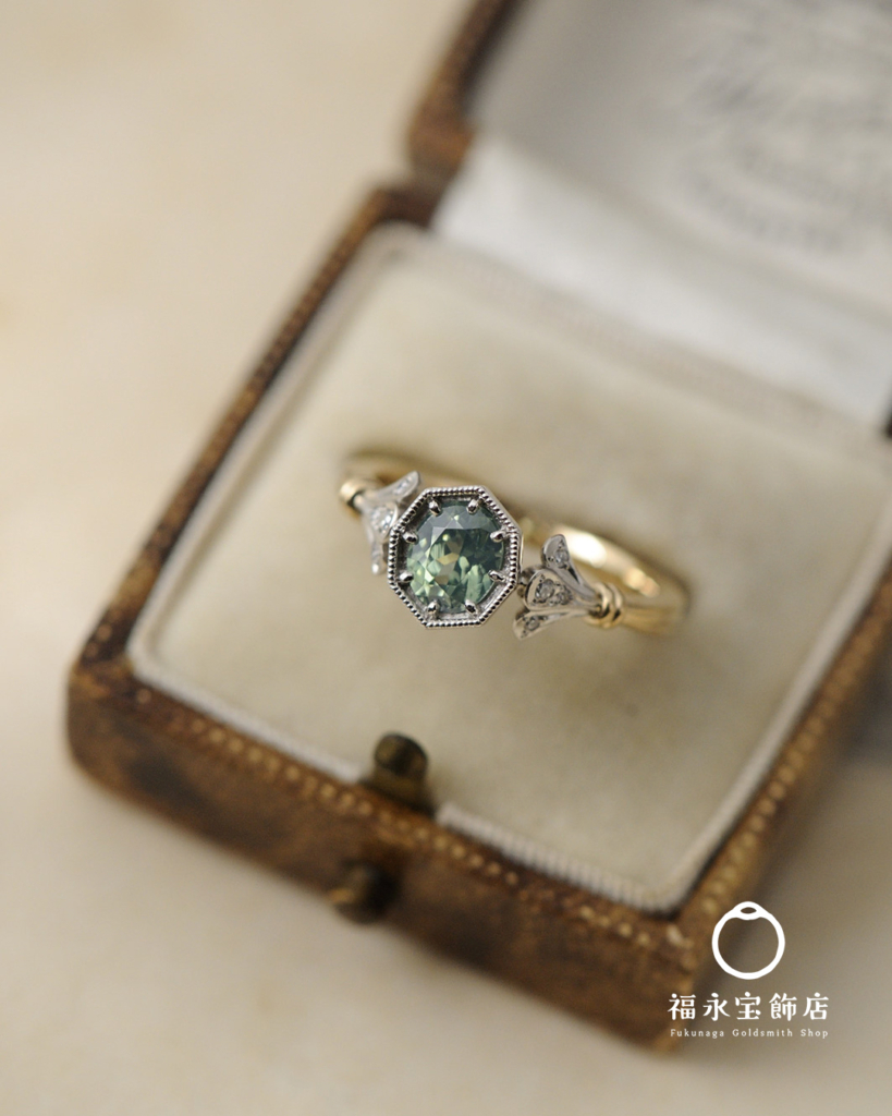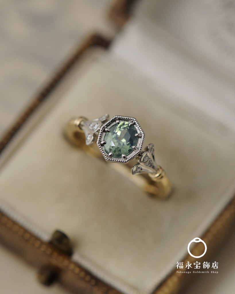 オーダーメイド 2026.04.15 gracelineのフルオーダー こちらはミニ貝殻とセンターストーンのタイプでご依頼いただきました。 センターはOctragon。 サファイアなのですが、なんとも言えない美しい色ですね。 深さのある石の場合は窓を開けて。 アーチ形の窓から覗く石もまた素敵。 プラチナ×YGです。 石の大きさ、石座の大きさとミニ貝殻のサイズ感が絶妙なバランスです。
