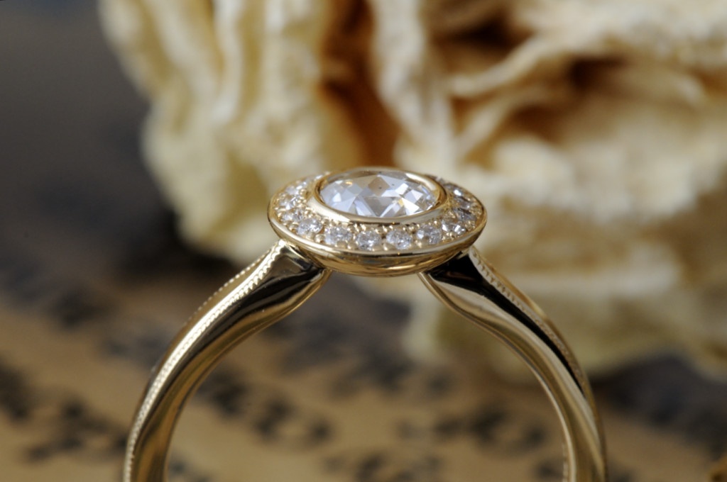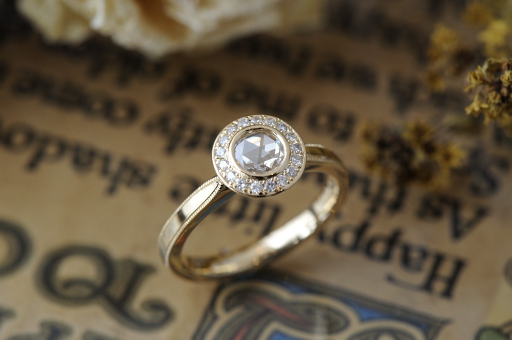 婚約指輪 2017.06.21 オーダーメイド婚約指輪//ローズカットダイヤモンド ハロタイプ 4.5㎜のローズカットダイヤの周りに、1.2㎜ほどのメレダイヤをぐるりと配しました。 腕はセンターに向けてすっきりと絞っています。 オリジナルデザインのHalo ringから展開していて、リング部分は内側の反り返りがなく、スッキリとした平打ち形状になっています。 石座はお椀型で、指馴染みが相当に良いものとなります。 商品についてのご相談・ご予約・お問い合わせはこちら