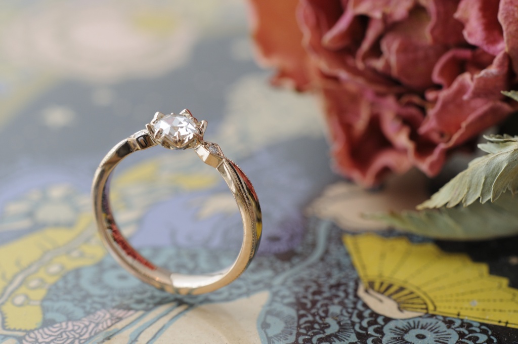 お花の上に、露が溜まったような印象を受ける、瑞々しいローズカットのエンゲージリングです。