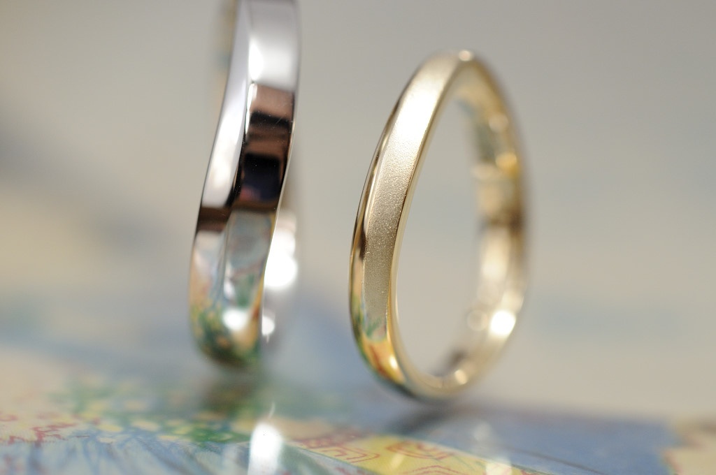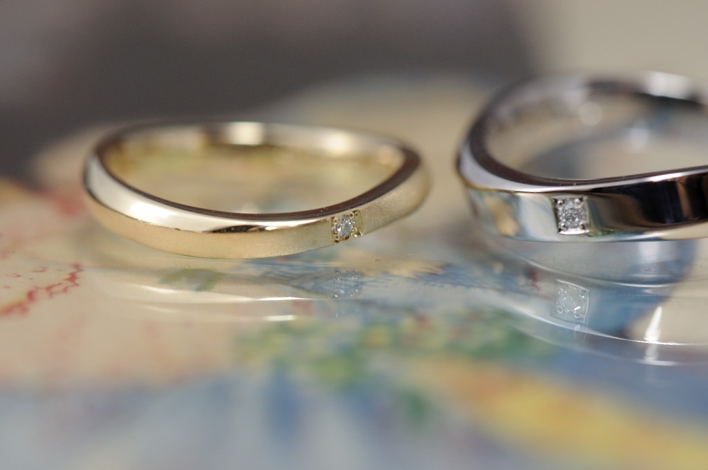 メンズはプラチナの鏡面仕上げに、トップにダイヤモンドを1石入れ、レディースはイエローゴールドで、トップのラインだけにサンドブラストを施し、ダイヤをメンズと同じく1石留めました。