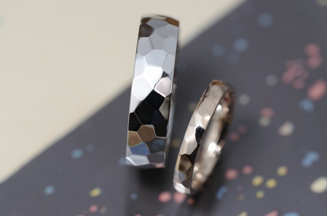 ボリュームのある鏡面鎚目のオーダーメイド結婚指輪