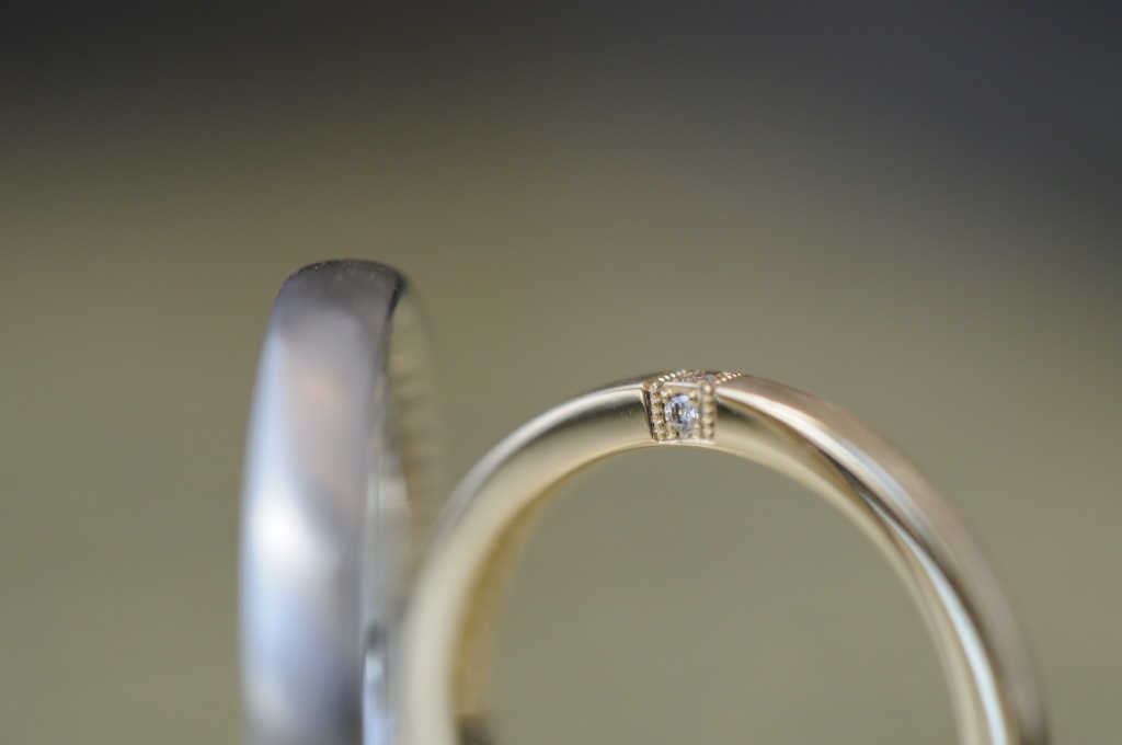 形は違いますが、トップのテクスチャをそろえることで、ペアらしさが十分に感じられる結婚指輪となりました。