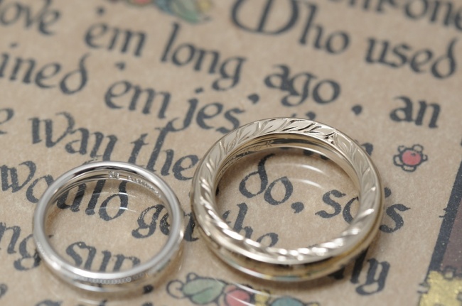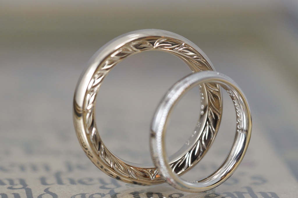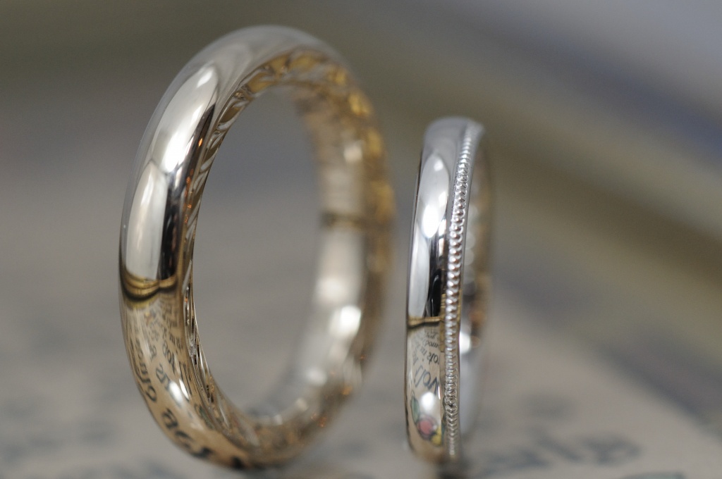 一見シンプルなシャンパンとプラチナ、レディースはミルグレイン、という組み合わせの結婚指輪。