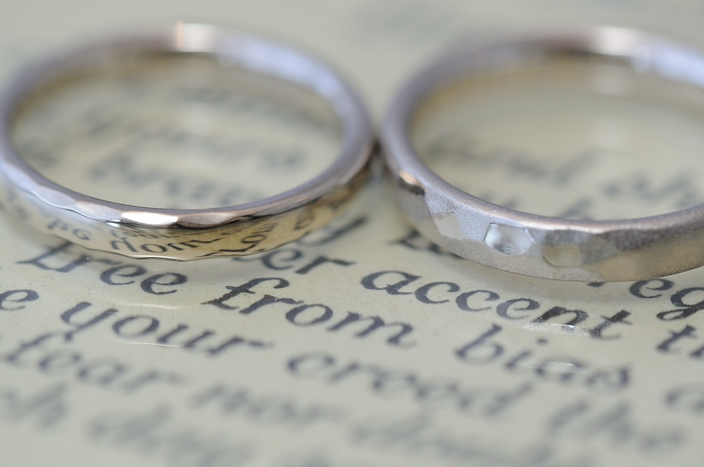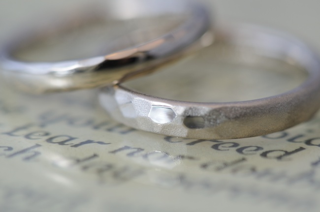 メンズは同じ素材、同じ甲丸リングに、表はシンプルなサンドブラストのテクスチャで、反対側、指の腹側に鎚目を入れました。