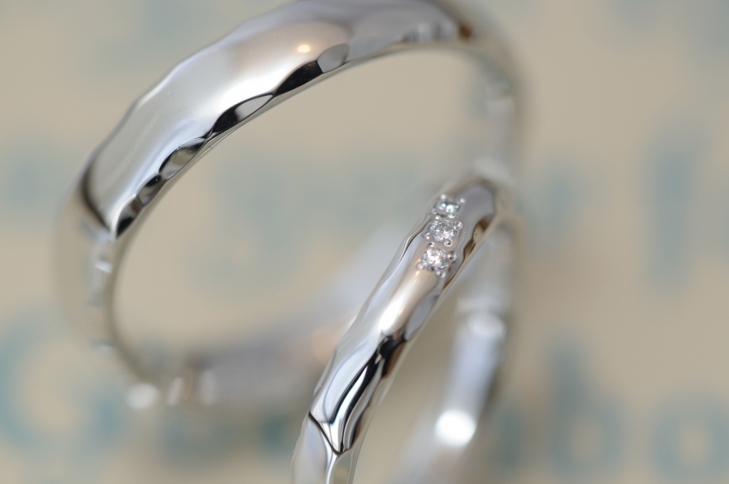 ピカピカの鏡面仕上げと、鎚目のキラキラ、ダイヤの輝きが合わさって、たくさんの表情を見せてくれる結婚指輪です。
