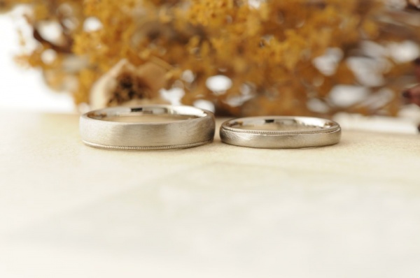 基本的にはシンプルなミルグレインの結婚指輪なのですが、今回はメンズ・レディースともに片側にのみミルグレインの加工を施しました。
