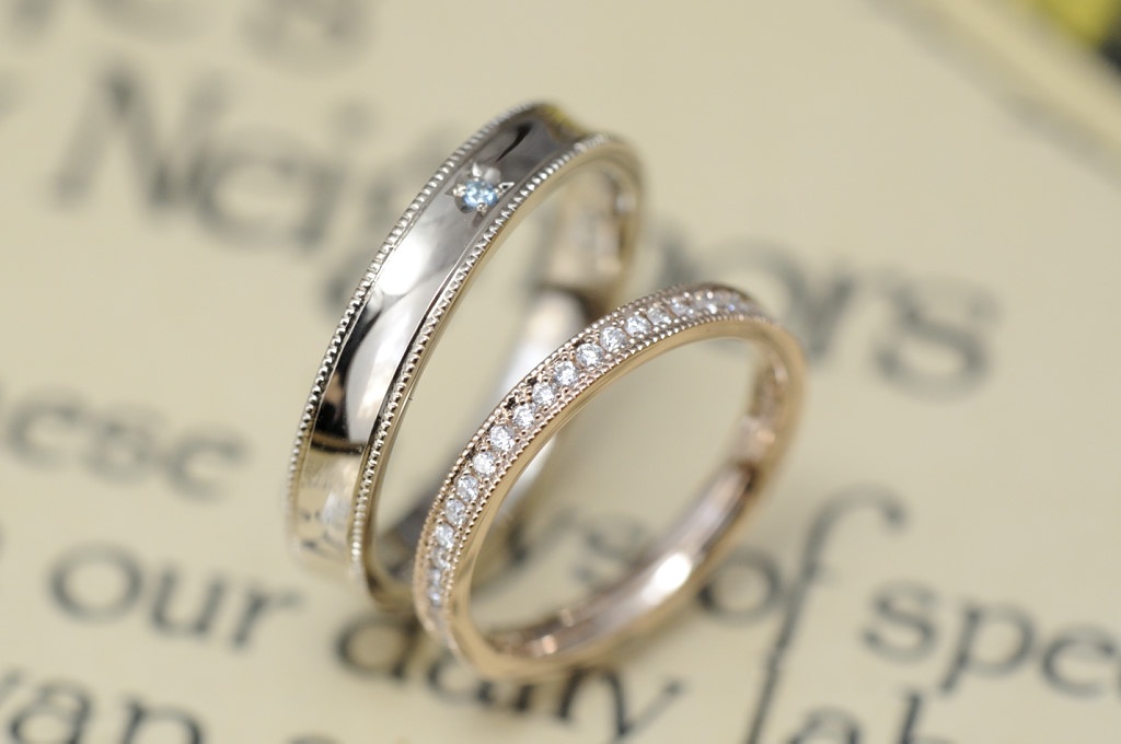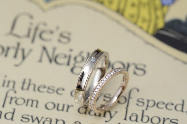 レディースはピンクゴールドのハーフエタニティーで、エッジの壁にミルグレインをはっきりと見えるくらいに施しました。