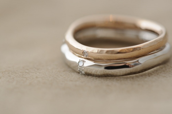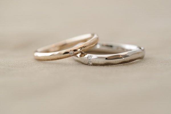 メンズは、表面をラフに削り出して、少し彫刻のような雰囲気に、レディースはそれに合わせて、でもくどくならないように両サイドのみ槌目を入れてメンズと揃えました。