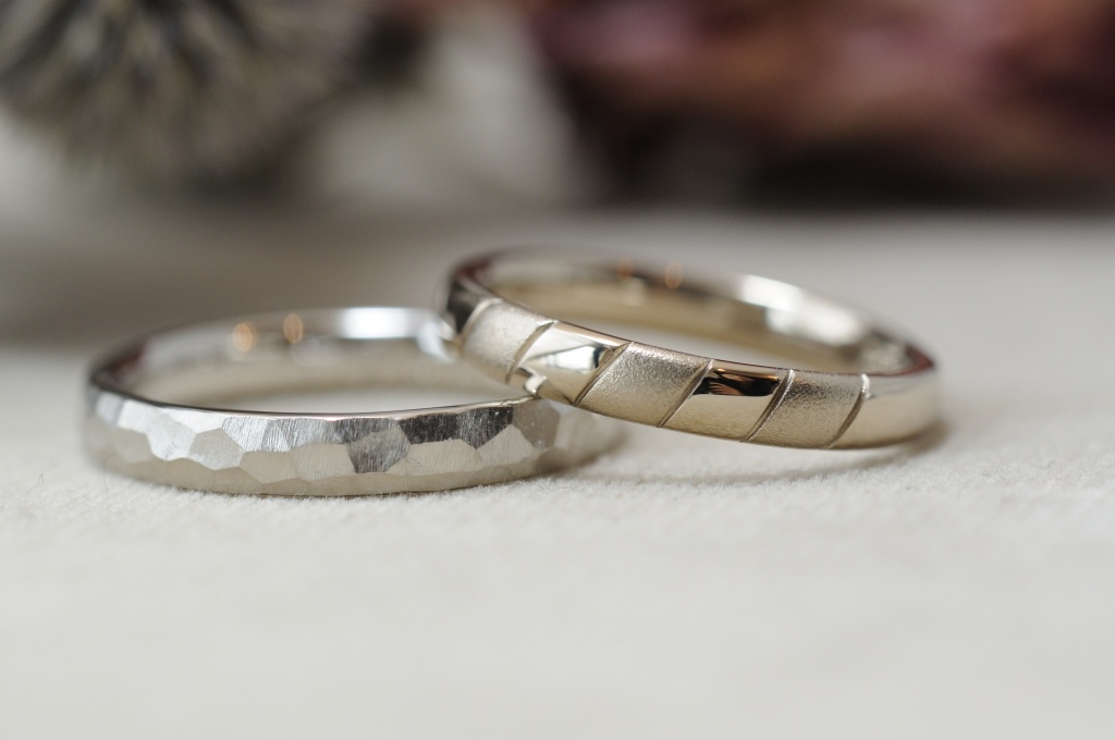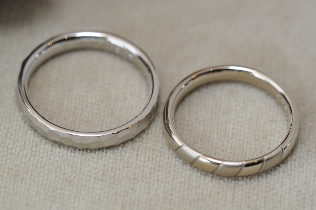 メンズはプラチナの鎚目、レディースはシャンパンゴールドに、ラインを入れてテクスチャをかけました。