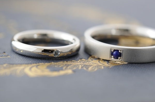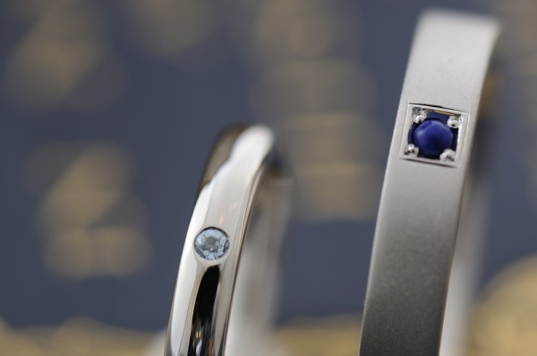 お互いに、それぞれの誕生石をトップに留めました。レディースは淡いブルートパーズ、メンズはラピスラズリ。