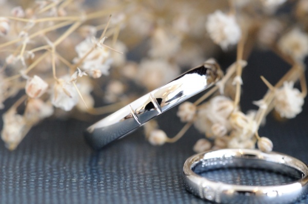 シンプルな中にも、女性にはダイヤとミルグレインの組み合わせでかわいらしく、男性側にはミルと同じ位置に溝を二筋スッと入れて、すっきりとメリハリをつけました。